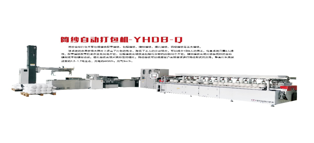 日照裕华机械YHDB-Q筒纱自动打包机系统主要包括配重模块、包膜模块、自动上袋模块、手/自动缝包模块、捆扎模块及码垛等模块构成,通过该系统很好的实现了对筒纱编织袋的自动打包过程;为适用客户需求,相继开发了静态喷码机、视觉检测、快速包膜机、绕膜包装、立体式单通道配重机及自动上纱机等设备。
